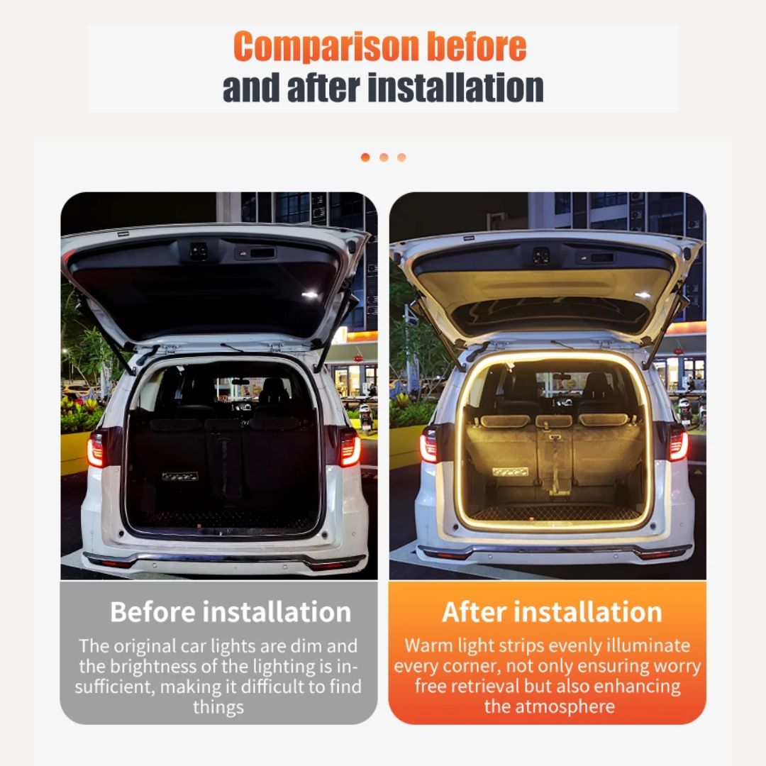 The Car Trunk LED Light Strip is designed for both function and style. Built with PVC waterproof construction, flexible material, and 2835 high-brightness lamp beads, this strip light creates soft, uniform lighting inside your car’s trunk. It installs easily—just plug and play—with automatic on/off functionality triggered by your car's system.